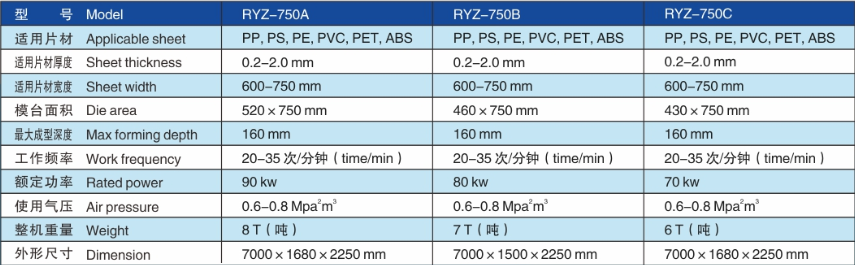 RYZ-750系列全自动液压制杯机是我司开发研制的高速度,高效率的全自动塑料容器的成型机。该机适用于生产PS,PP,PVC,PET,ABS等塑料片材